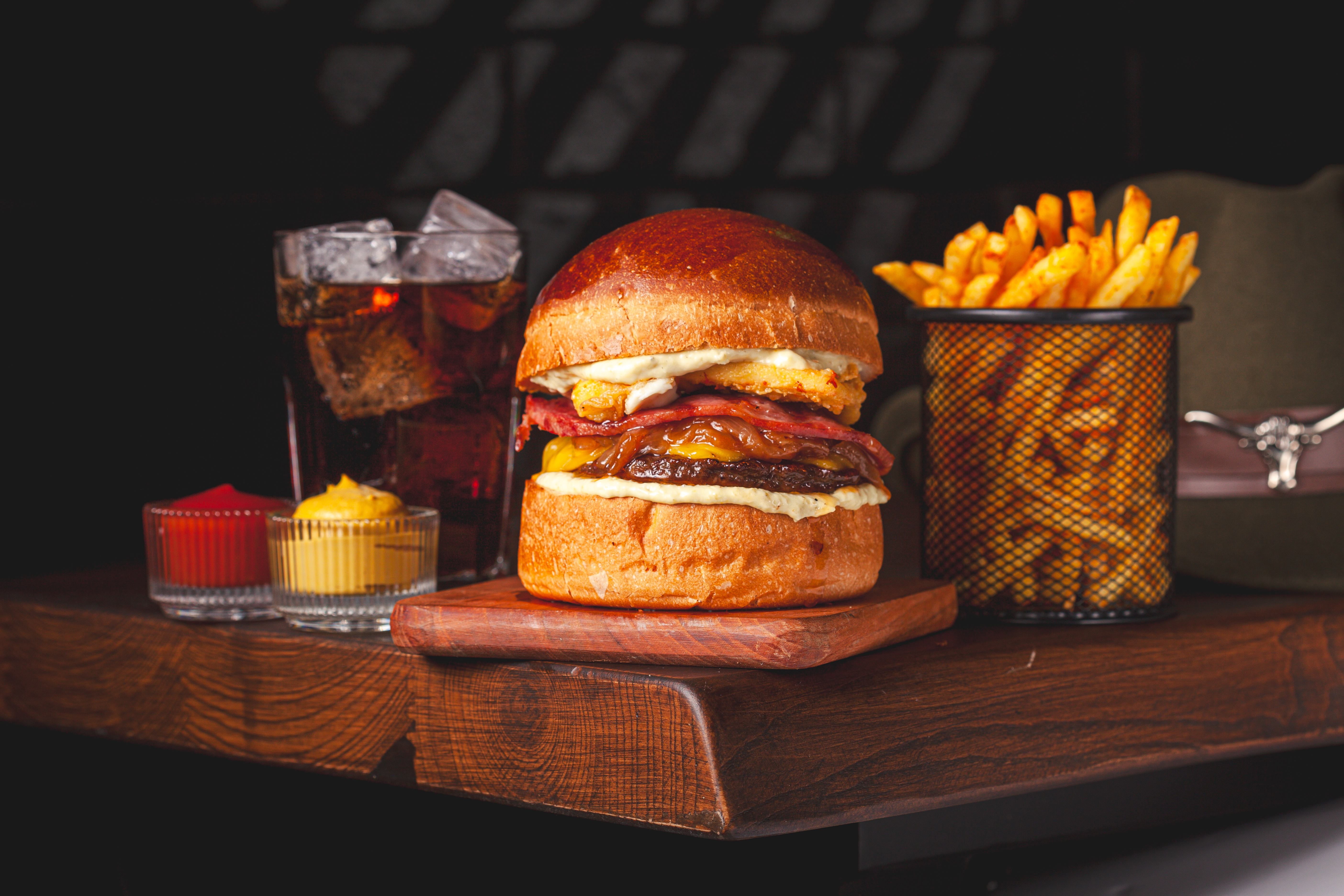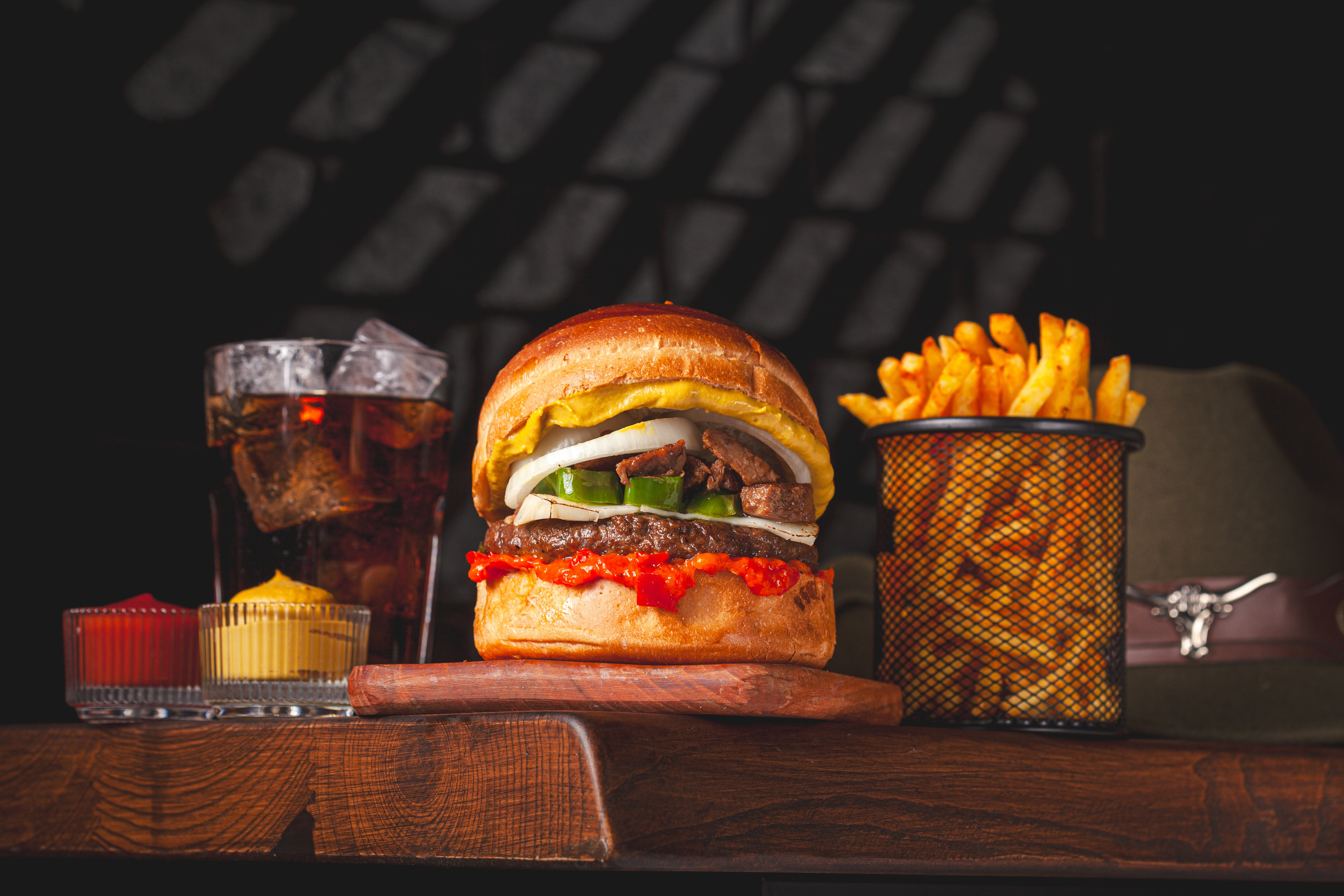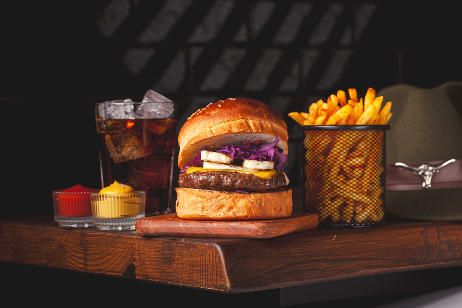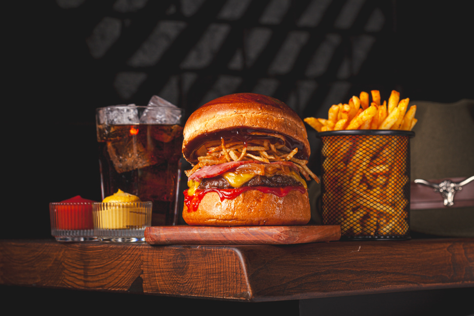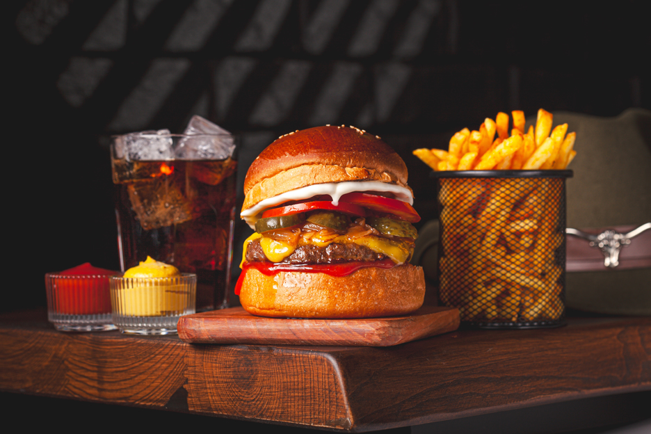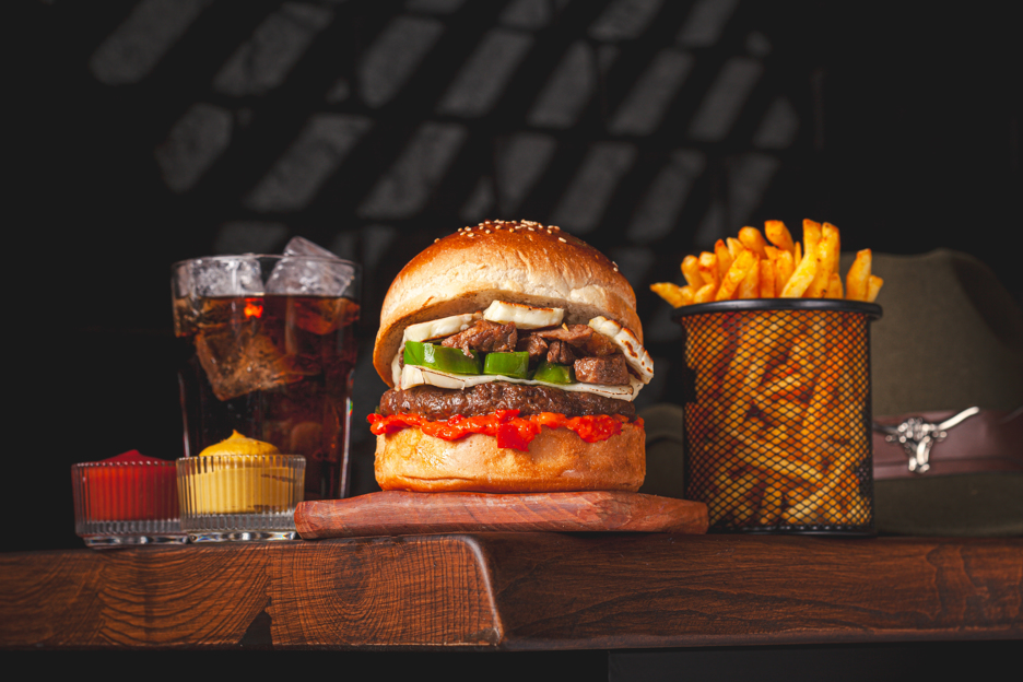 120 gr. Hamburger Köftesi, Özel Sos, Cheddar Peyniri, Karamelize Soğan, Çıtır Kaşar , Dana bacon. 150 gr. Patates Kızartması ve Ketçap&Mayonez ile.