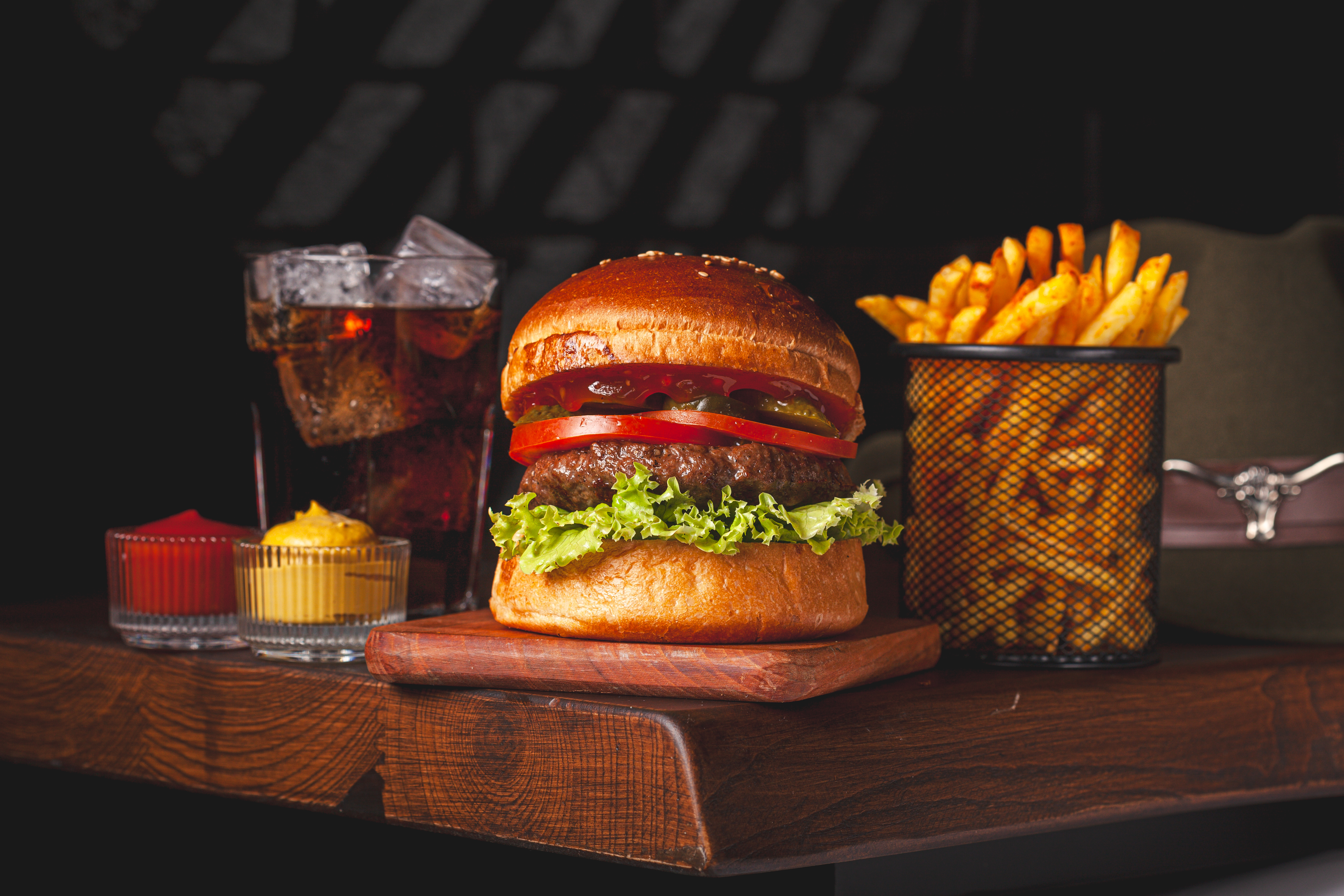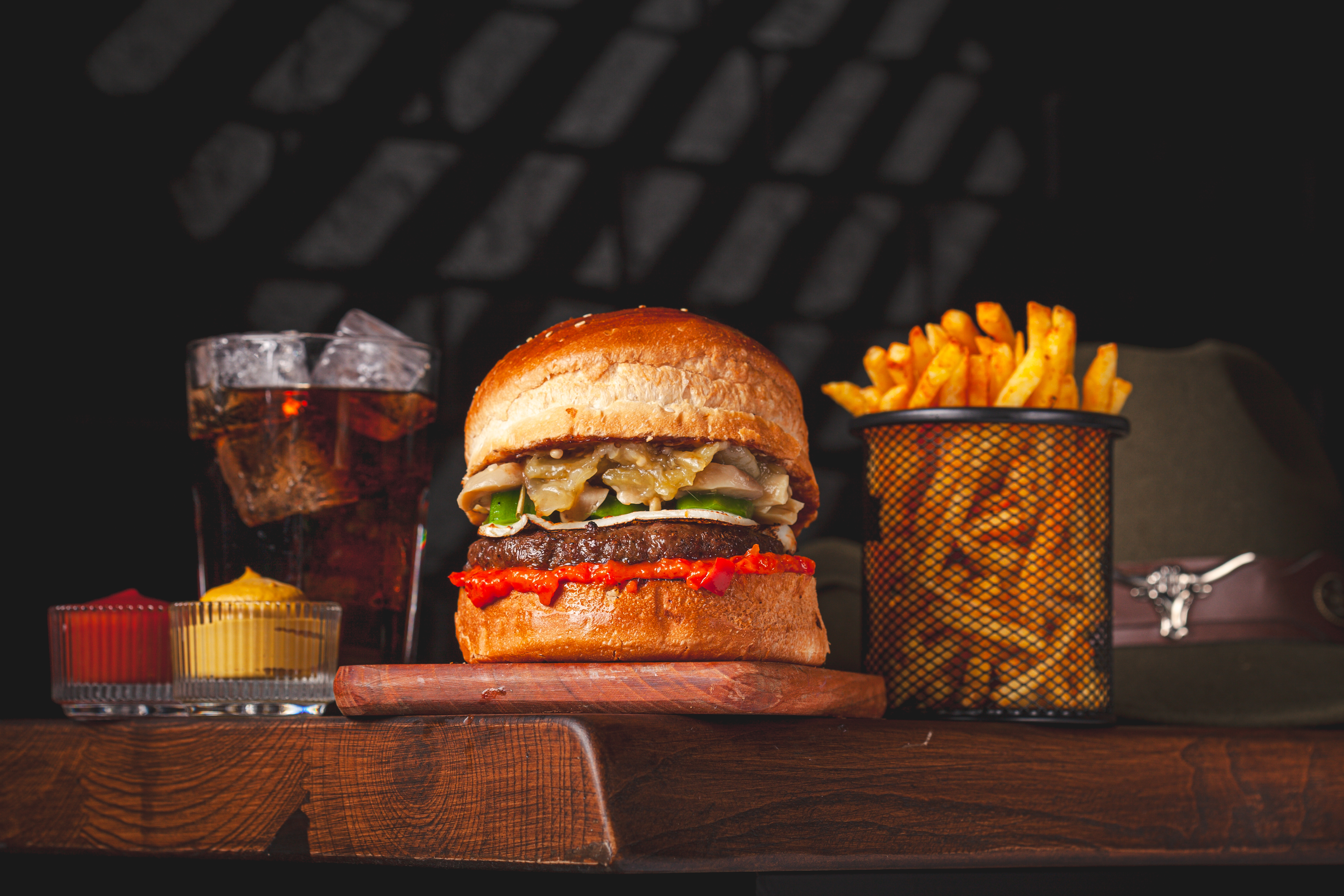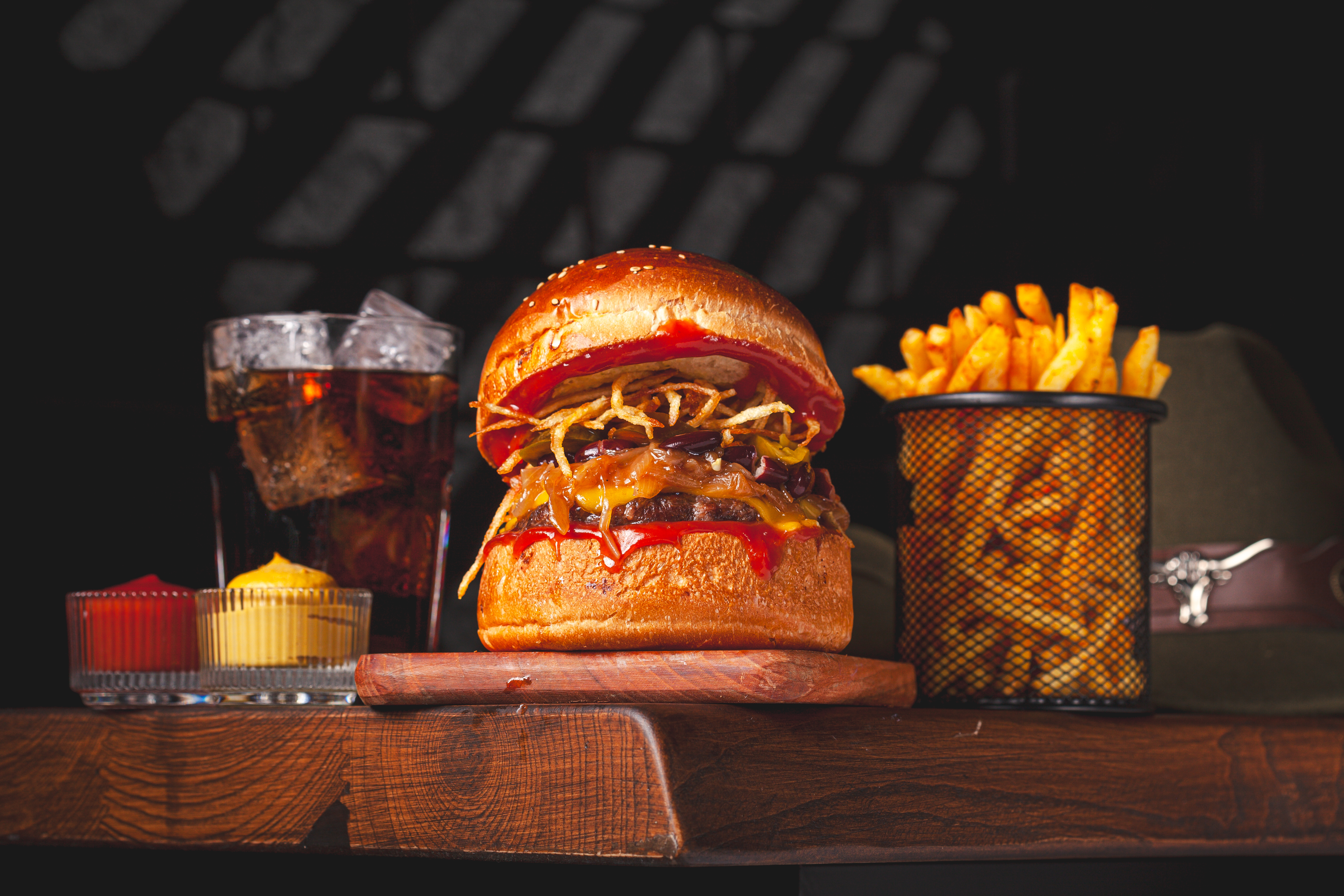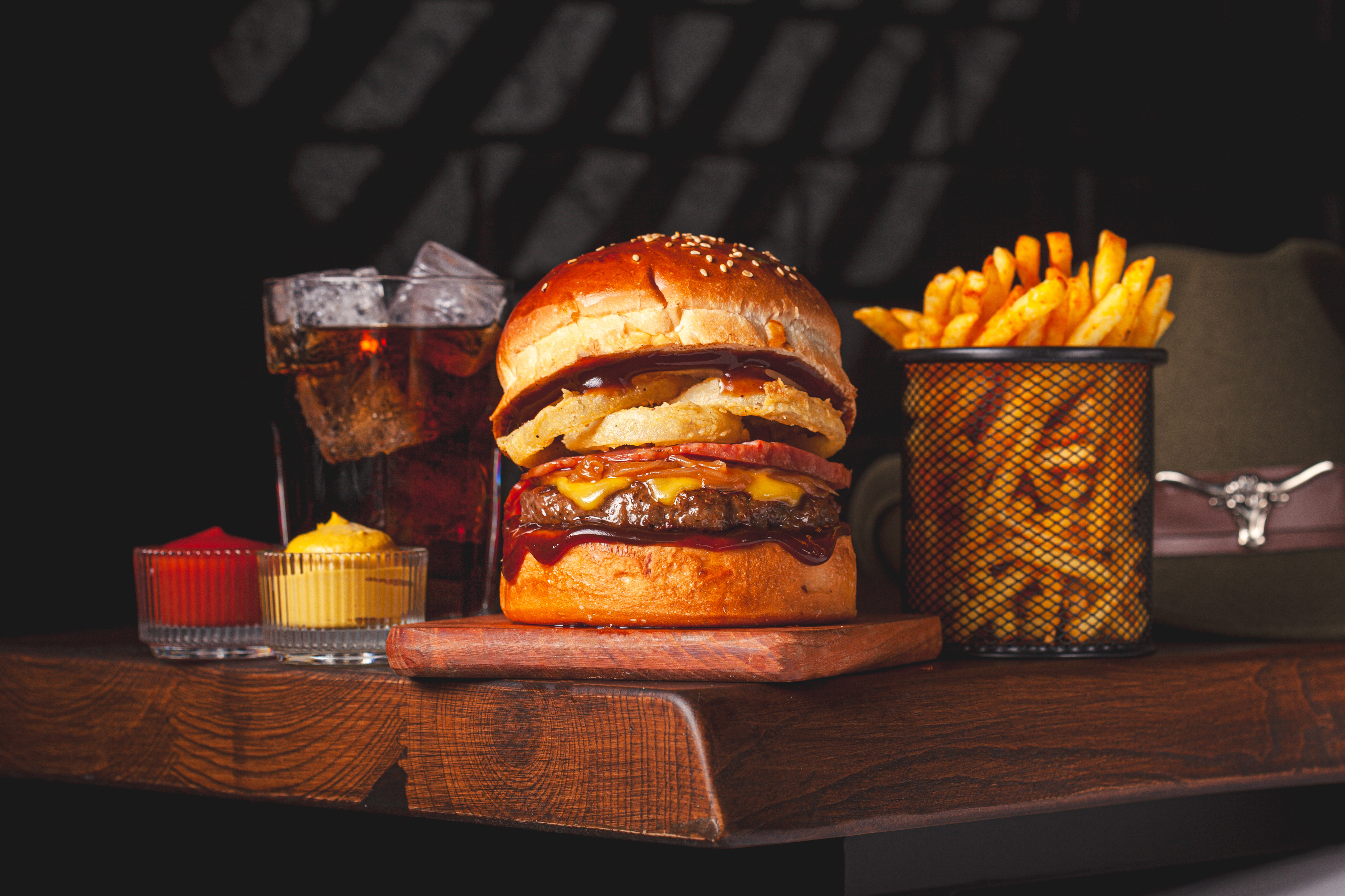 120 gr. Hamburger Köftesi, Özel Sos, Cheddar Peyniri, Karamelize Soğan, Çıtır Kaşar , Dana bacon. 150 gr. Patates Kızartması ve Ketçap&Mayonez ile.